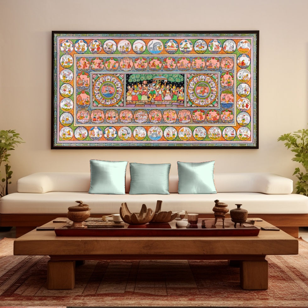 'Bhagwat Leela' is a large masterpiece that vividly narrates 62 legends of Lord Krishna, painted in the traditional Pattachitra style. This expansive canvas is a riot of colors, each hue and stroke telling a different tale from Krishna's life—from his mischievous childhood to his profound teachings. Ideal for a prominent display, this artwork not only decorates a space but also serves as a focal point for cultural storytelling and spiritual reflection.