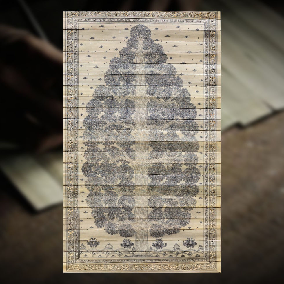 The 'Tree of Life' etched on a medium palm leaf in monochrome is a profound piece of art symbolizing growth, interconnection, and the cycle of life. This artwork combines the simplicity of black and white with the complexity of its symbolic representation, offering a contemplative piece that fits well in any space focused on peace, meditation, or philosophical reflection.
